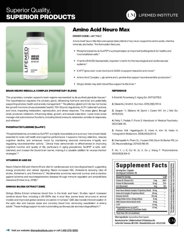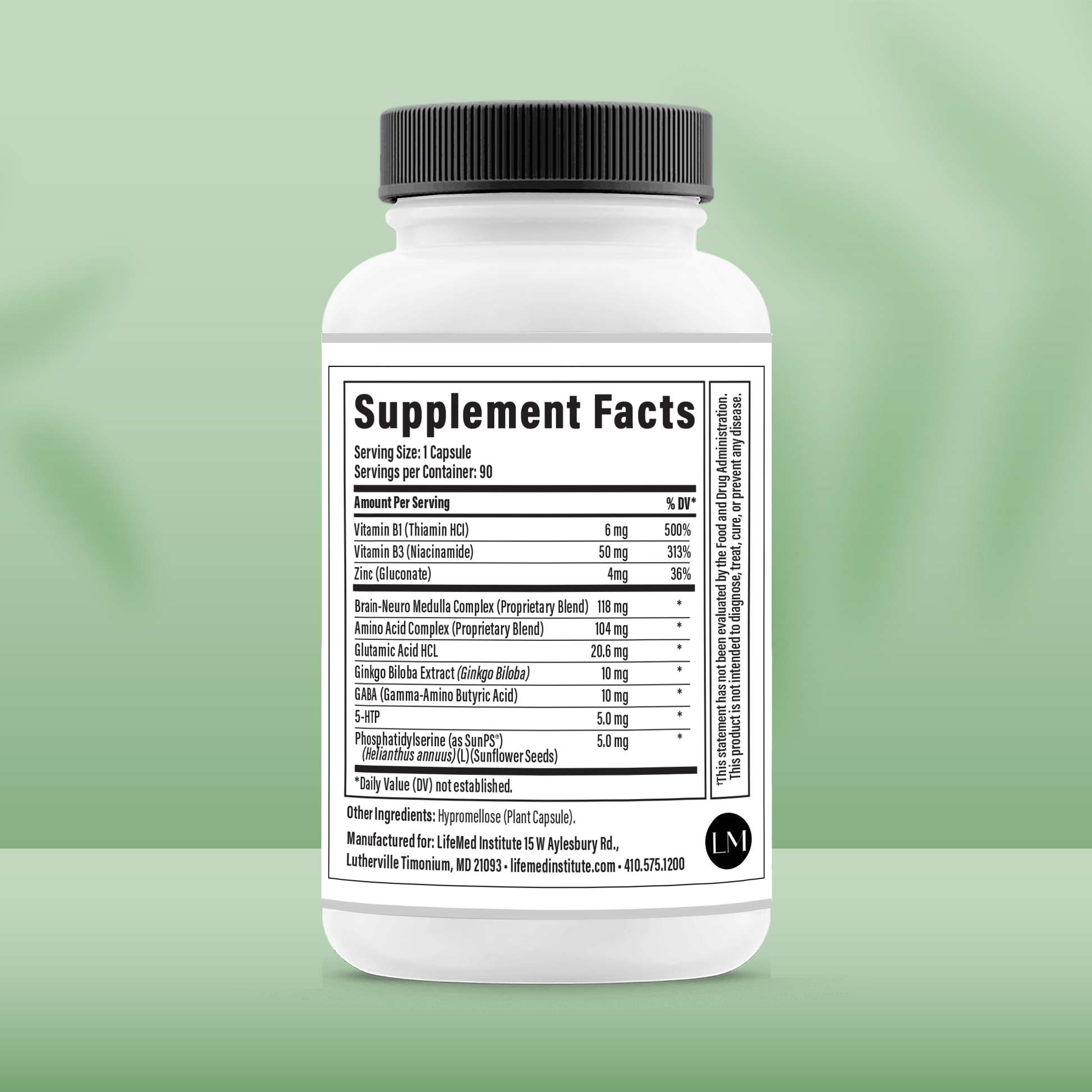 Vitamin B1 (Thiamin HCI), Vitamin B3 (Niacinamide), Zinc (Gluconate), Brain-Neuro Medulla Complex (Proprietary Blend), Amino Acid Complex (Proprietary Blend), Glutamic Acid HCL, Ginkgo Biloba Extract 24% (Ginkgo Biloba), GABA (Gamma-Amino Butyric Acid), 5-HTP, Phosphatidylserine (as Sun PS®) (Helianthus Annuus) (L) (from sunflower seeds)