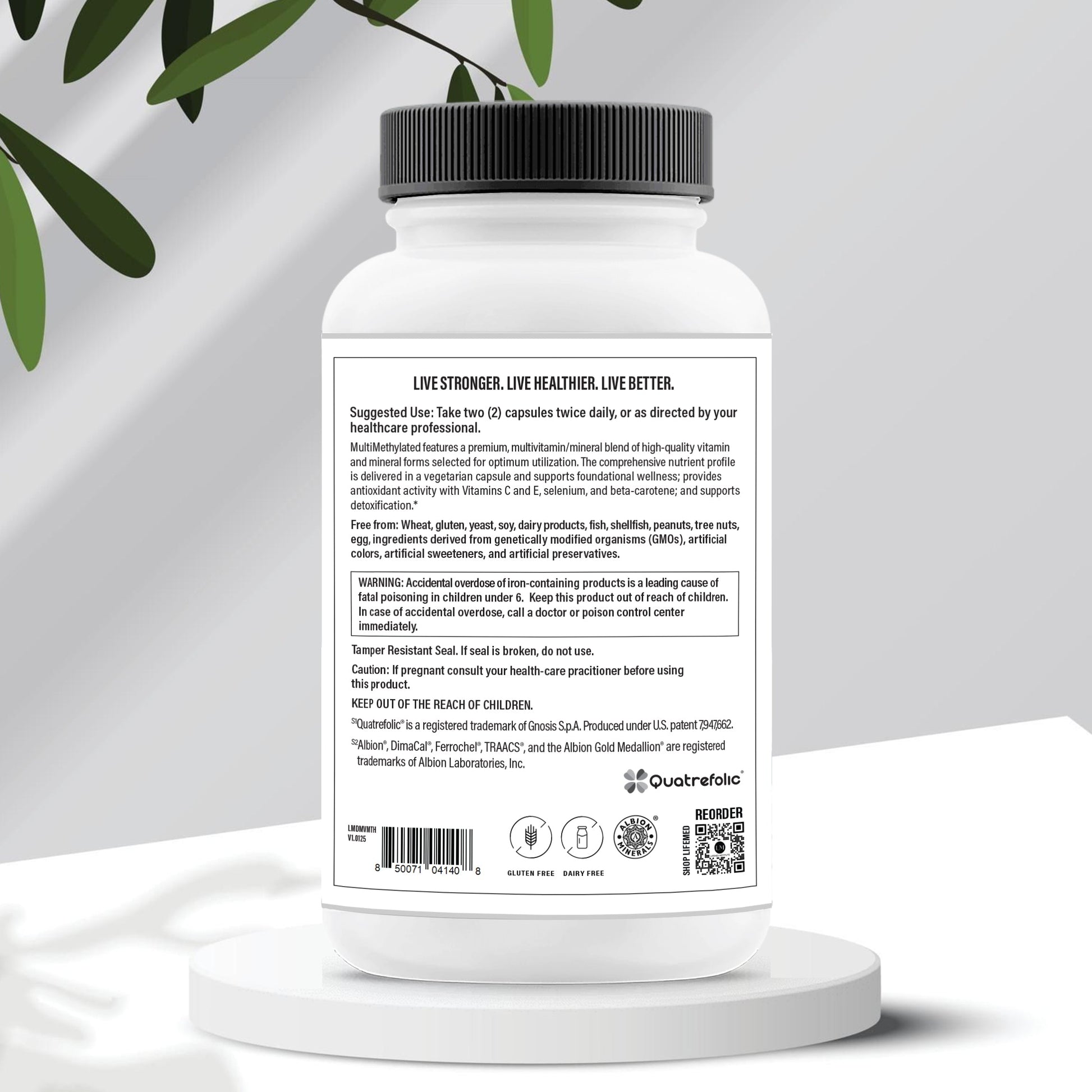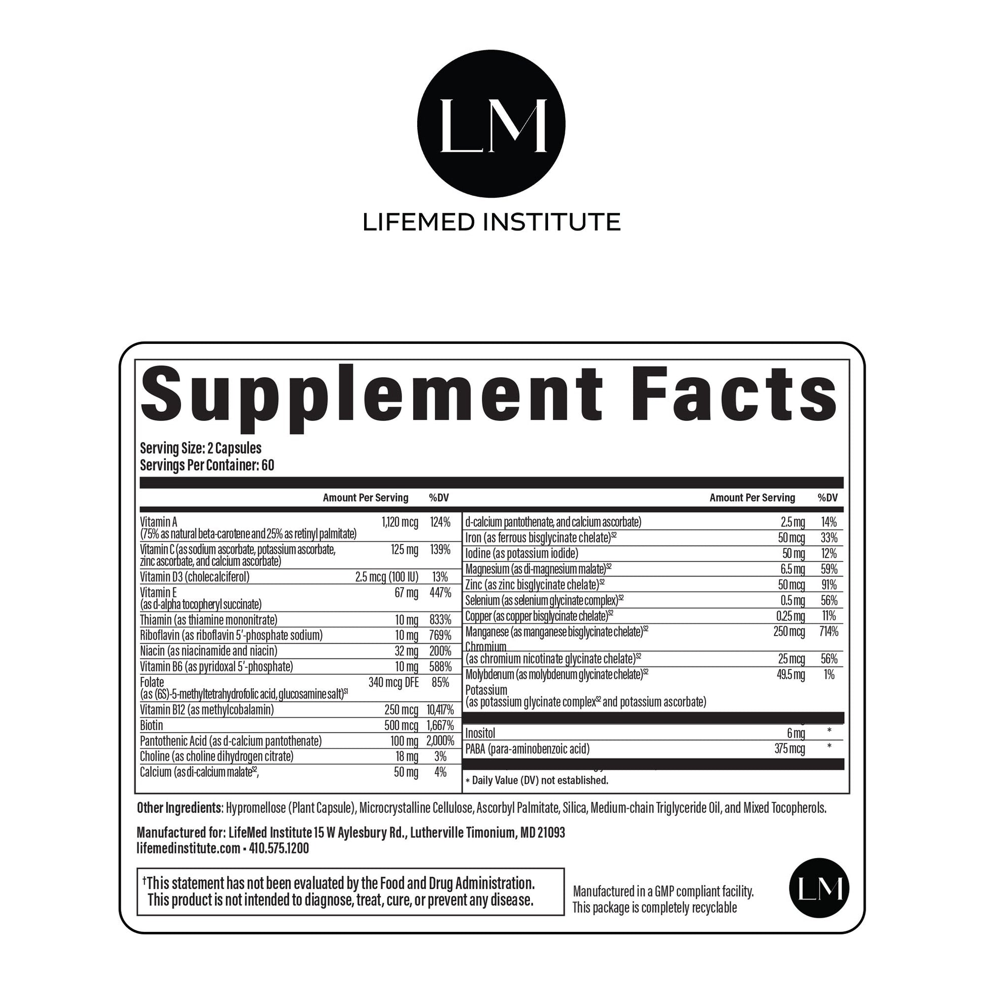 Vitamin A (75% as natural beta-carotene and 25% as retinyl palmitate), Vitamin C (as sodium ascorbate, potassium ascorbate, zinc ascorbate, and calcium ascorbate), D3 (cholecalciferol), Vitamin E (as d-alpha tocopheryl succinate), Thiamin (as thiamine mononitrate), Riboflavin (as riboflavin 5’-phosphate sodium), Niacin (as niacinamide and niacin), Vitamin B6 (as pyridoxal 5’-phosphate), Folate (as (6S)-5-methyltetrahydrofolic acid, glucosamine salt), Vitamin B12 (as methylcobalamin), Biotin, Pantothenic Acid (as d-calcium pantothenate), Choline (as choline dihydrogen citrate), Calcium (as di-calcium malate, d-calcium pantothenate, and calcium ascorbate), Iron (as ferrous bisglycinate chelate), Iodine (as potassium iodide), Magnesium (as di-magnesium malate), Zinc (as zinc bisglycinate chelate), Selenium (as selenium glycinate complex), Copper (as copper bisglycinate chelate), Manganese (as manganese bisglycinate chelate), Chromium (as chromium nicotinate glycinate chelate), Molybdenum (as molybdenum glycinate chelate), Potassium (as potassium glycinate complex and potassium ascorbate), Inositol, PABA (para-aminobenzoic acid), Vanadium (as vanadium nicotinate glycinate chelate), (hypromellose and water), microcrystalline cellulose, ascorbyl palmitate, silica, medium-chain triglyceride oil, and mixed tocopherols.