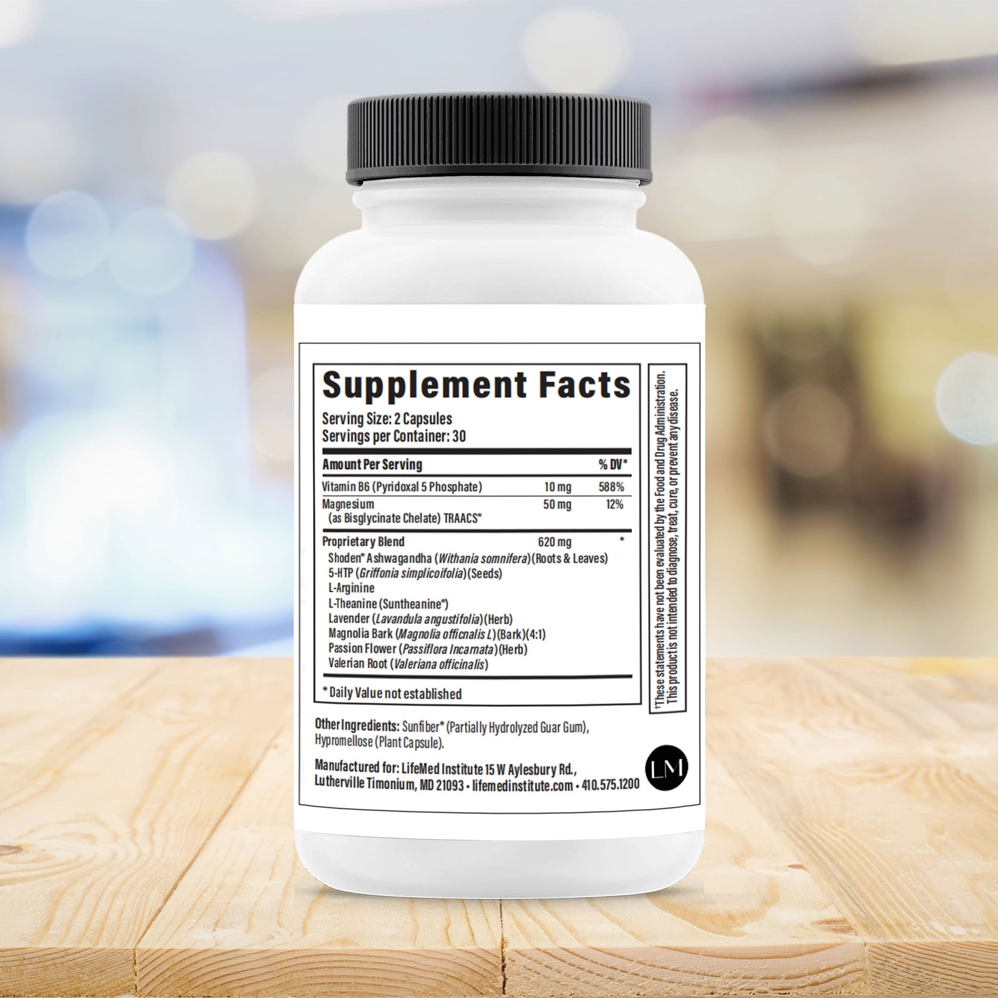 5-HTP ,Ashwagandha Root ,L-Arginine ,L-Theanine (Suntheanine®) ,Lavender ,Magnesium Bisglycinate chelate TRAACS® ,Magnolia Bark Extract ,Passion Flower ,Shoden® ashwagandha ,Valerian Root ,Vitamin B6 (as Pyridoxal 5-Phosphate)